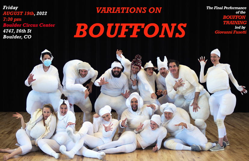 A group of performers who have already trained in the style of Bouffons and Grotesque Theatre during the last two Bouffon Intensives in Boulder (2022 & 2024), has returned to work on the devising of Four Bouffons Pieces. Each piece contains a vision of a Bouffon Show, with the ambition of developing into a longer theatre performance.