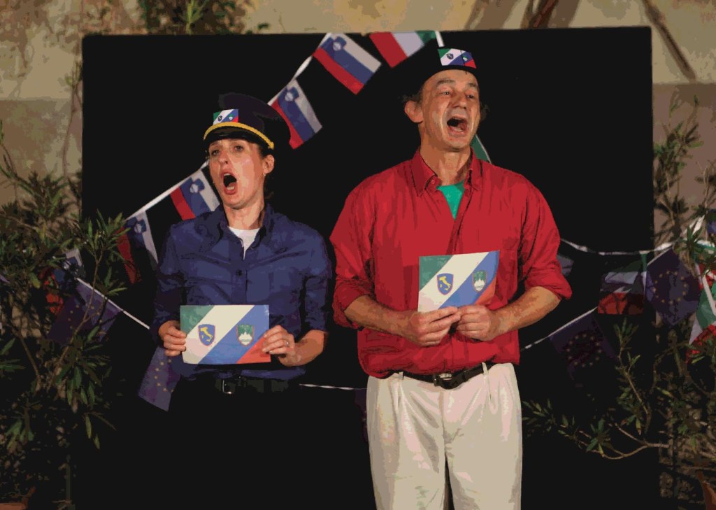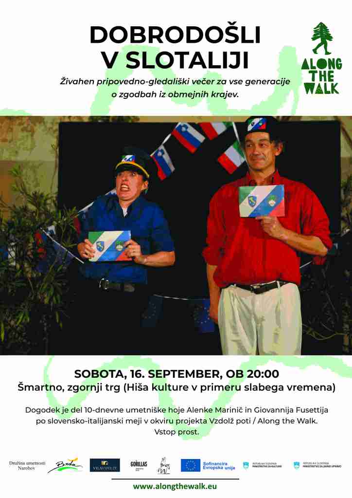 WELCOME TO SLOTALIA is a vivid storytelling-theater evening in public space in Slovenian and Italian. It is a playful show about the story of the land and the people that live by the border betweeen Slovenia and Italy. An evening filled with historical facts, humor, songs, mad characters and an unexpected twist at the end, driven and told by two virtuosic storytellers, Giovanni Fusetti and Alenka Marinič. A show for all generations made from the land and for the people that live there. Join us in Slotalia!