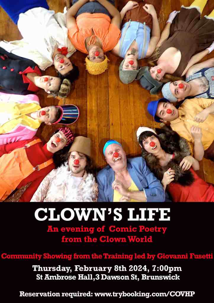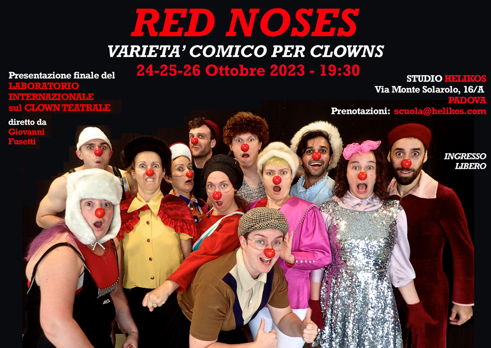 Questa serata è l’ultima tappa del Laboratorio Internazionale sul CLOWN TEATRALE diretto a Padova da Giovanni Fusetti. Gli allievi hanno incontrato la più piccola maschera del teatro, il NASO ROSSO, esplorando il mondo della propria comicità individuale. Prima di diventare un personaggio teatrale, il clown è uno stato di presenza e vitalità scenica, dove l’attore esplora la sua più unica e personalissima stupidità e la trasforma in comicità.